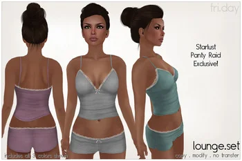 Inside the gold clam you'll find 3 exclusive colors of the Lounge.Set. These colors will only be available during the Panty Raid through August 31, 2010.